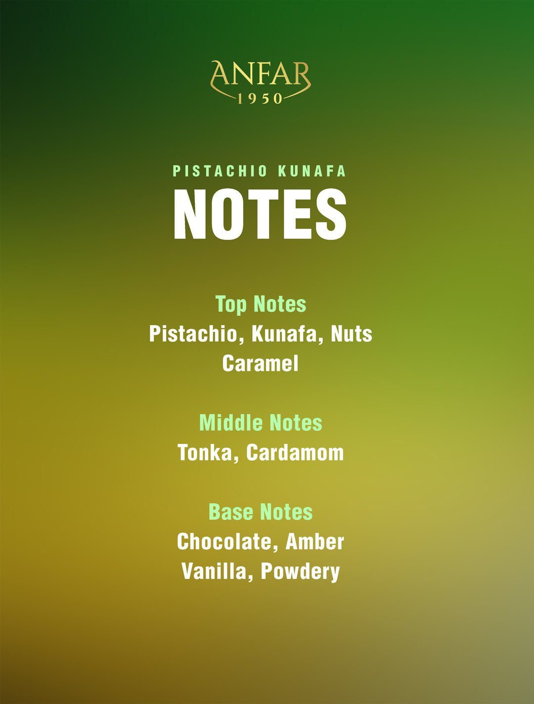 TOP NOTES Pistachio, Kunafa, Nuts Caramel MIDDLE NOTES Tonka, Cardamom BASE NOTES Chocolate, Amber Vanilla, Powdery